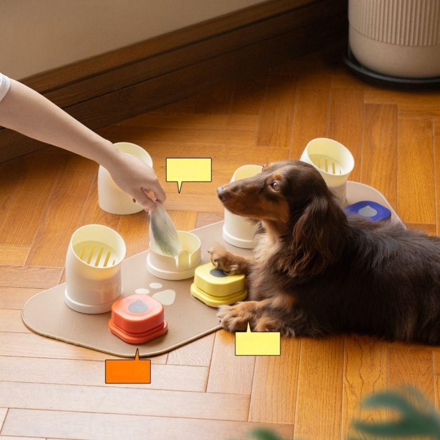 ปุ่มกระดิ่งอัจฉริยะ สามารถอัดเสียงและกดเพื่อเล่นเสียง ปุ่มพูดคุยสื่อสารน้องหมาเช่นหิวขนม หรือขอให้เปิดประตู หรือบันทึกเสียงได้ด้วย เป็นต้น